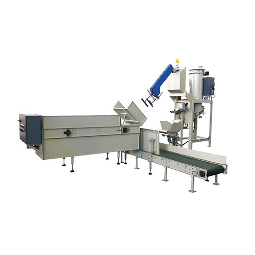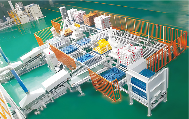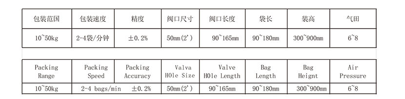 一条全自动气动阀口袋包装线包含:PVPE气动阀口袋包装机、自动上袋机械手、袋仓和输送机。
